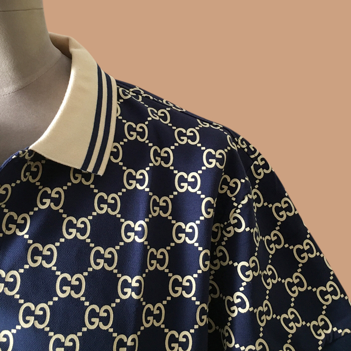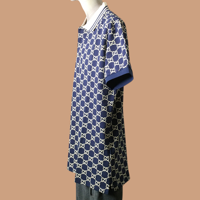 グッチ メンズ クルーネック ネイビー LOGO  ポロ半袖Tシャツ -