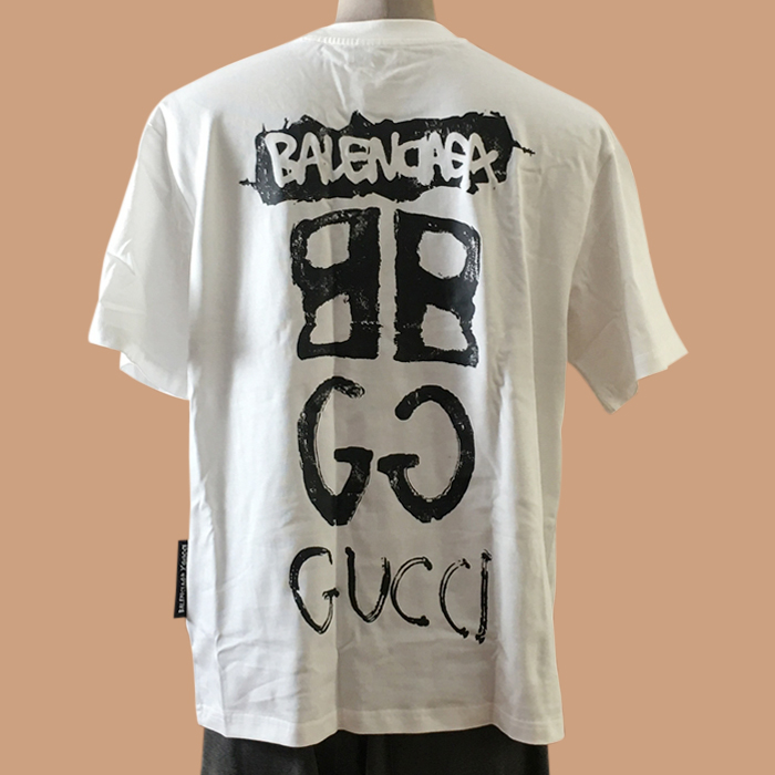 バレンシアガ&グッチ ユニセックス クルーネック ホワイト 半袖Tシャツ -