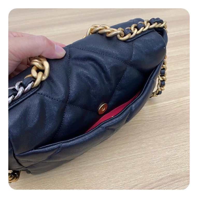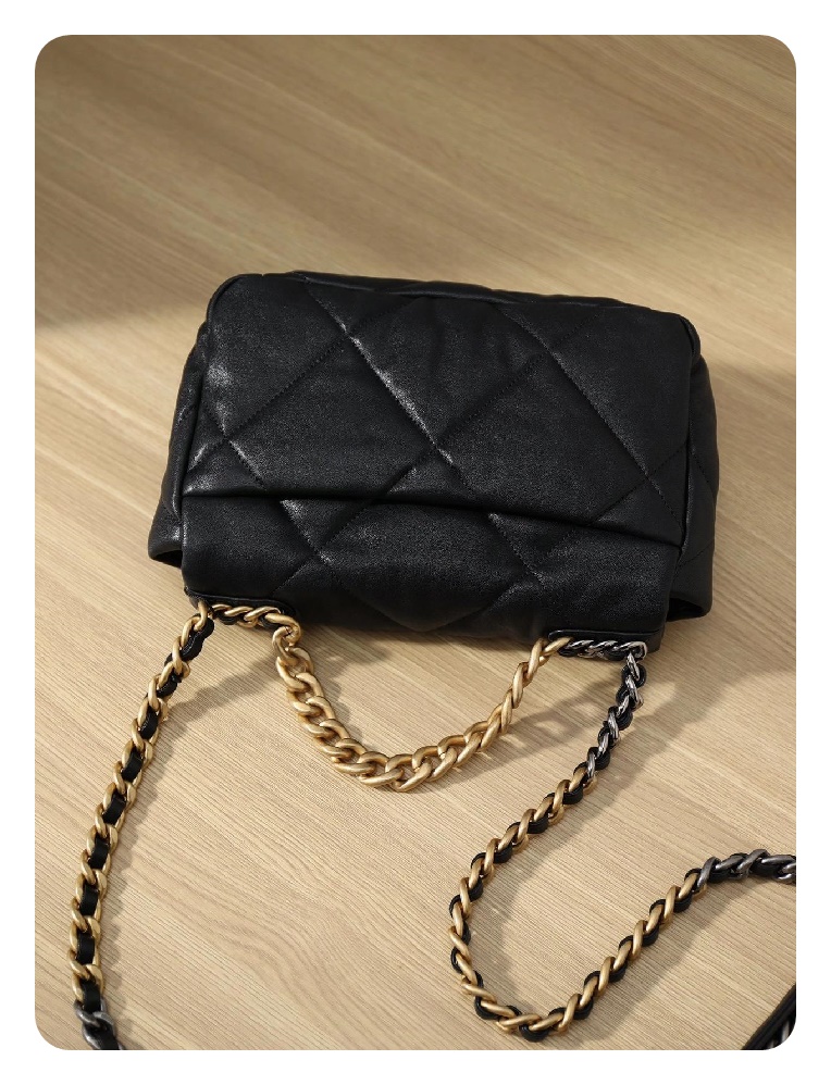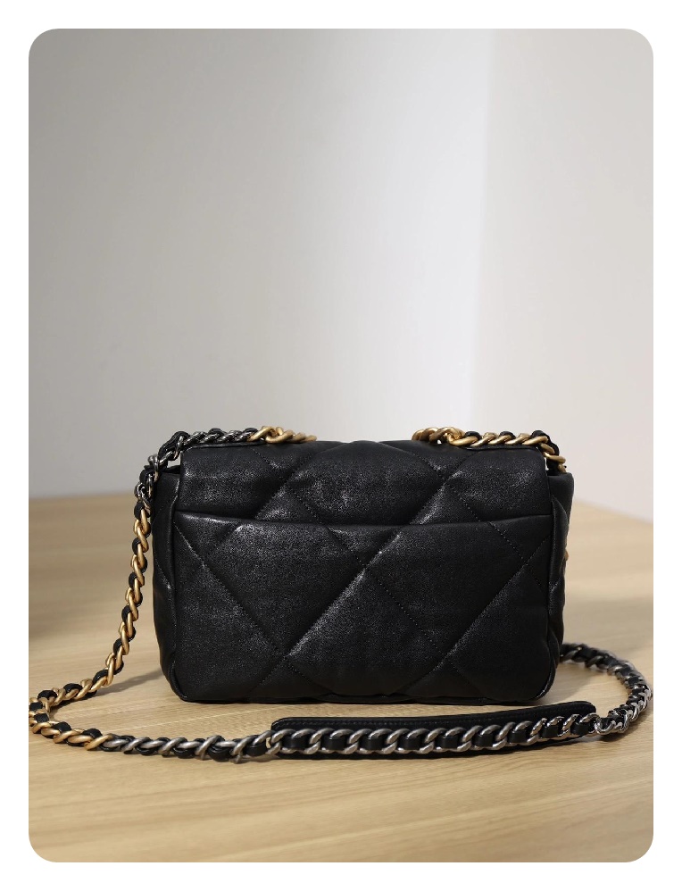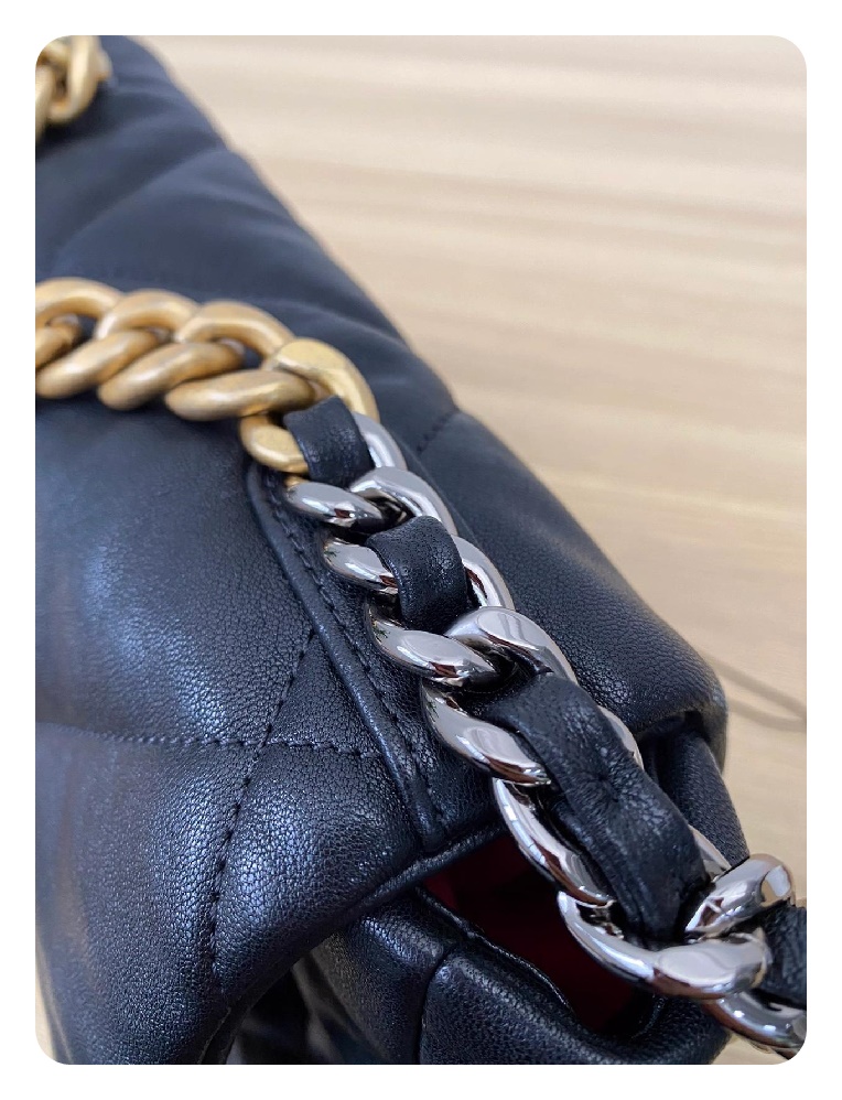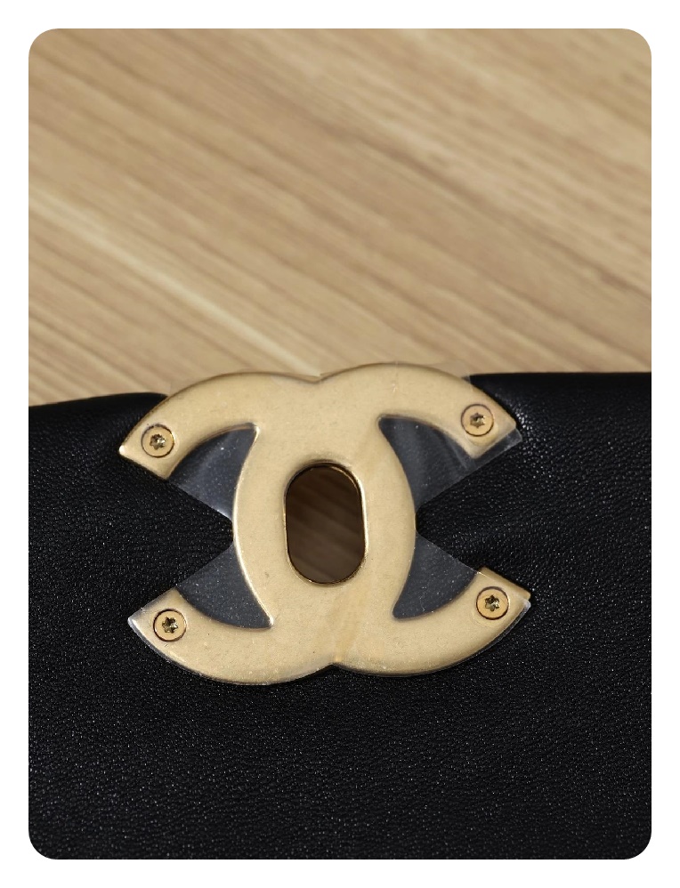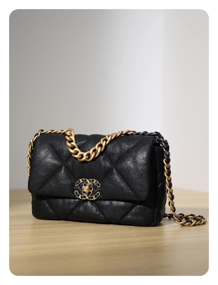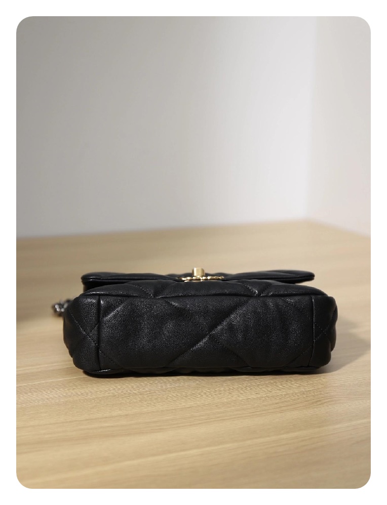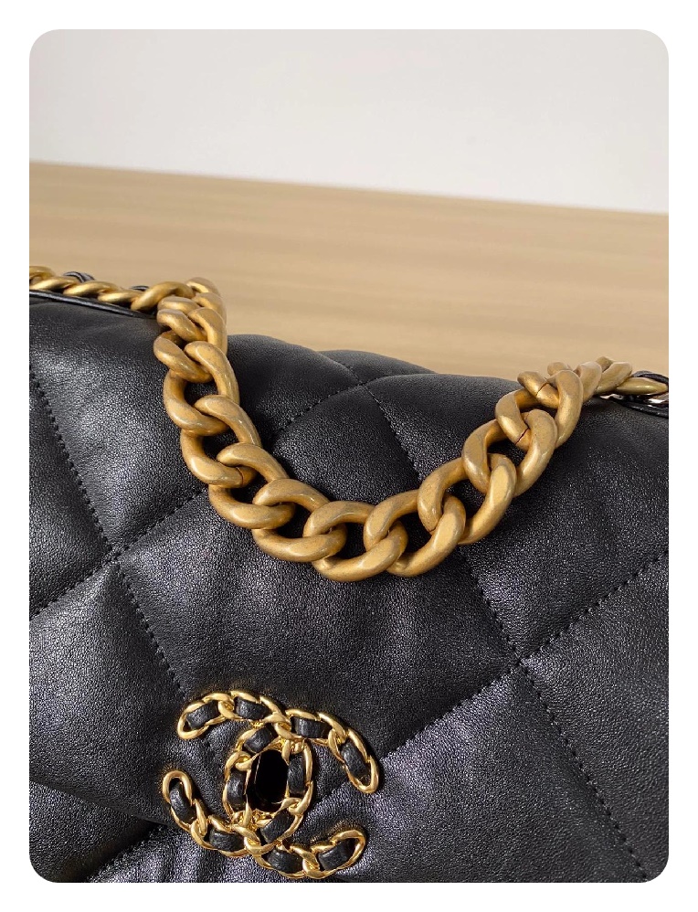 シャネル19フリップバッグゴートスキンミディアムブラックゴールドe19h2681
