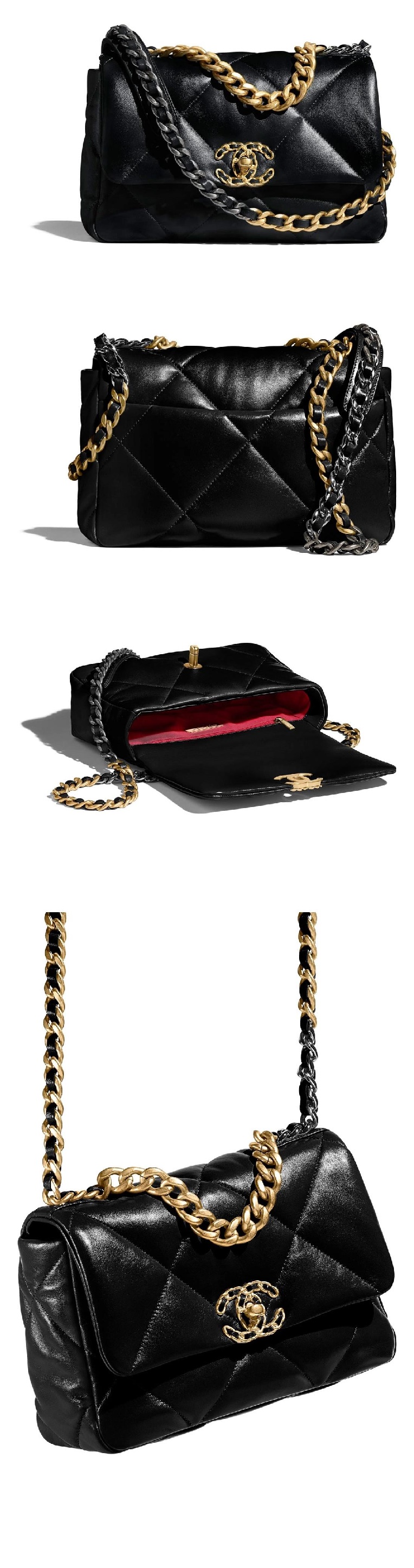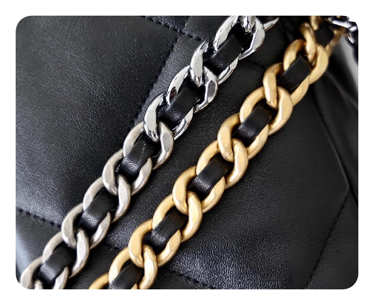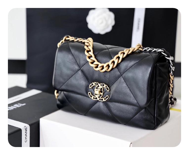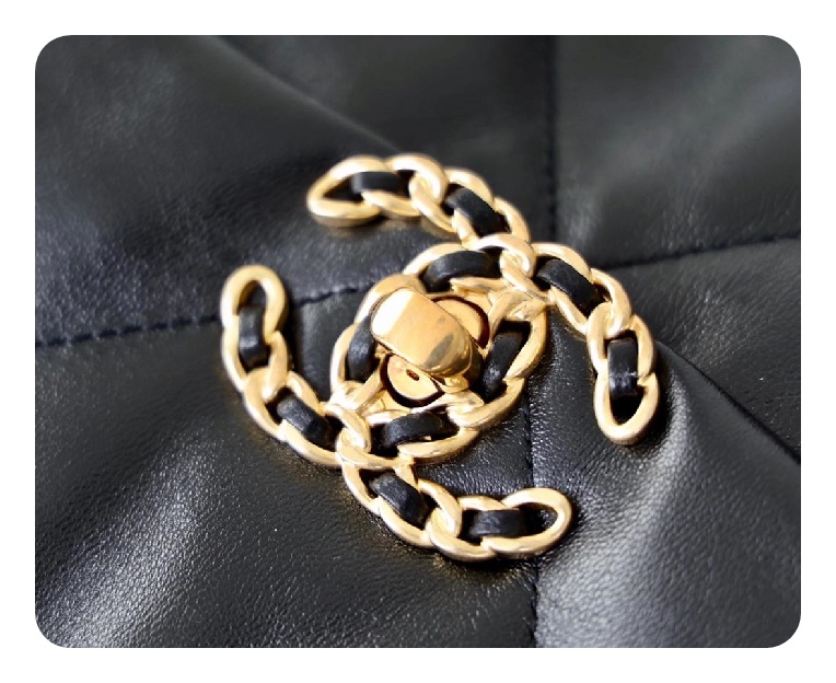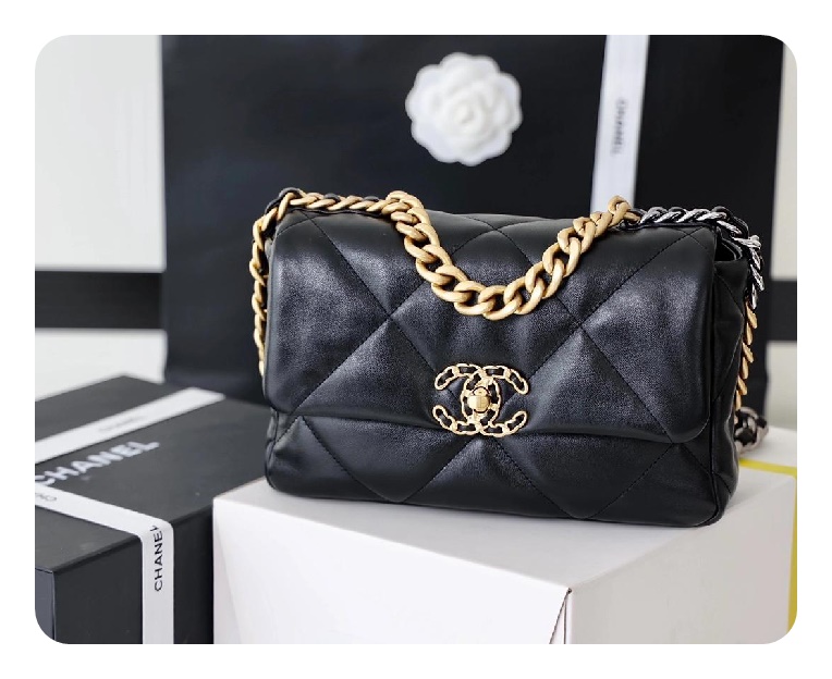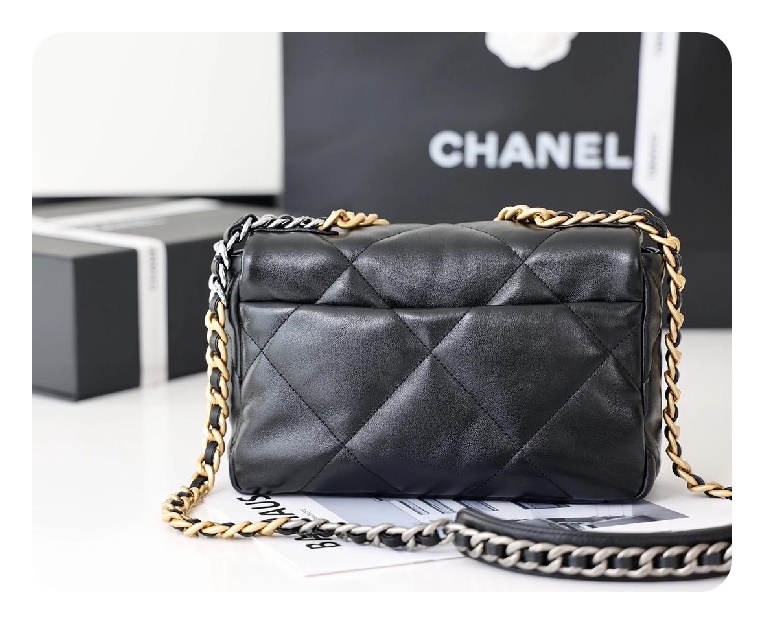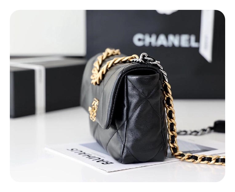 シャネル19フリップバッグラムスキンミディアムブラックゴールドe19h2682