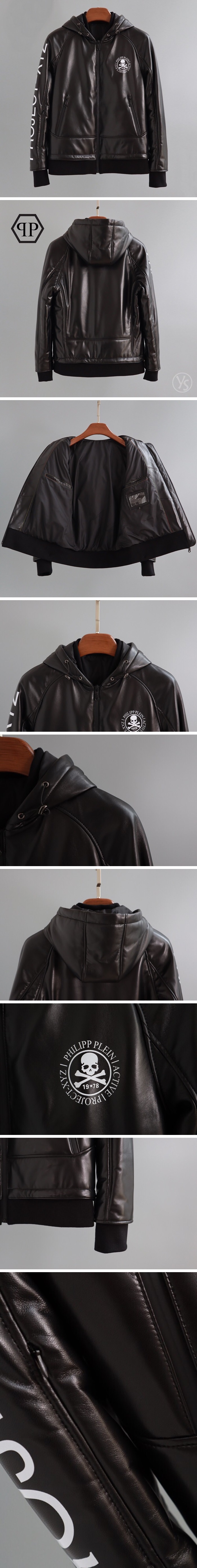 フィリッププレインメンズレザーフードジャケットi0064ブラック