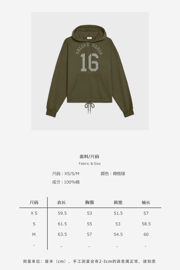セリーヌユニセックスコットンフーディl0149カーキ