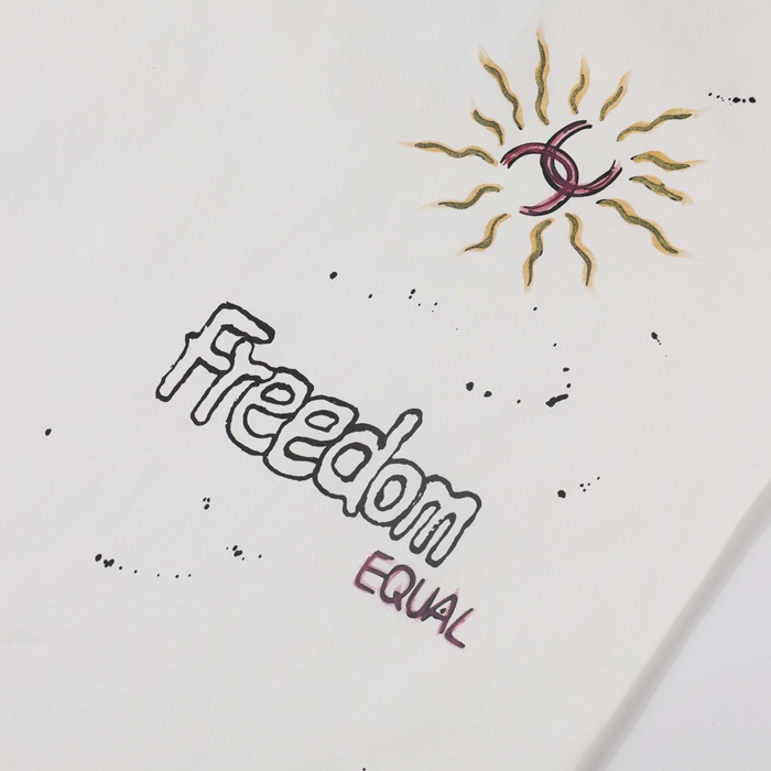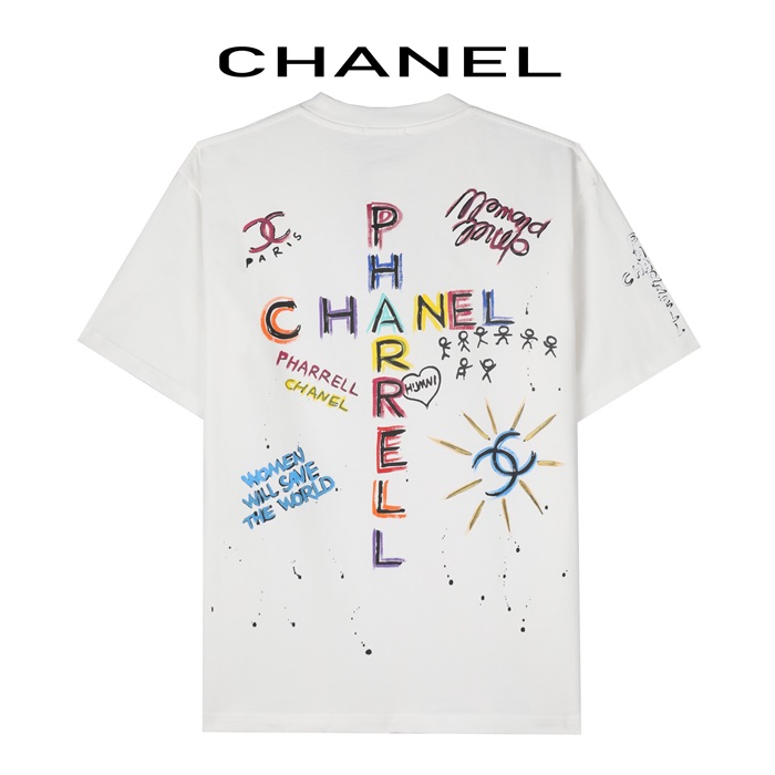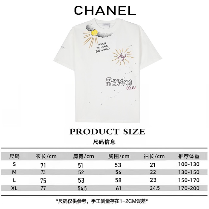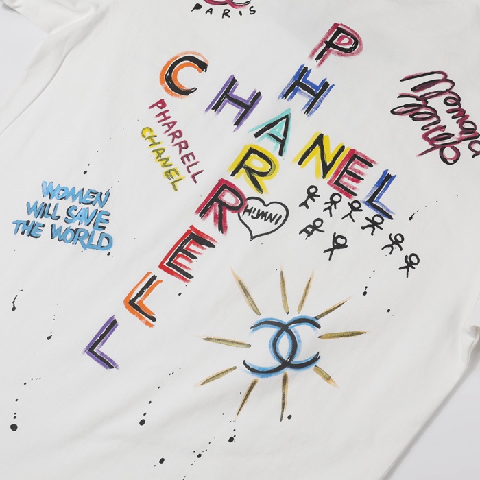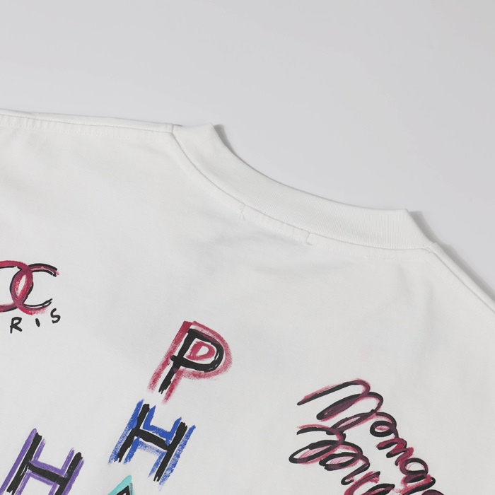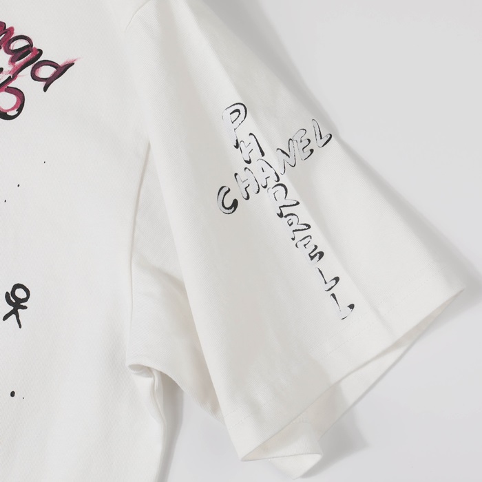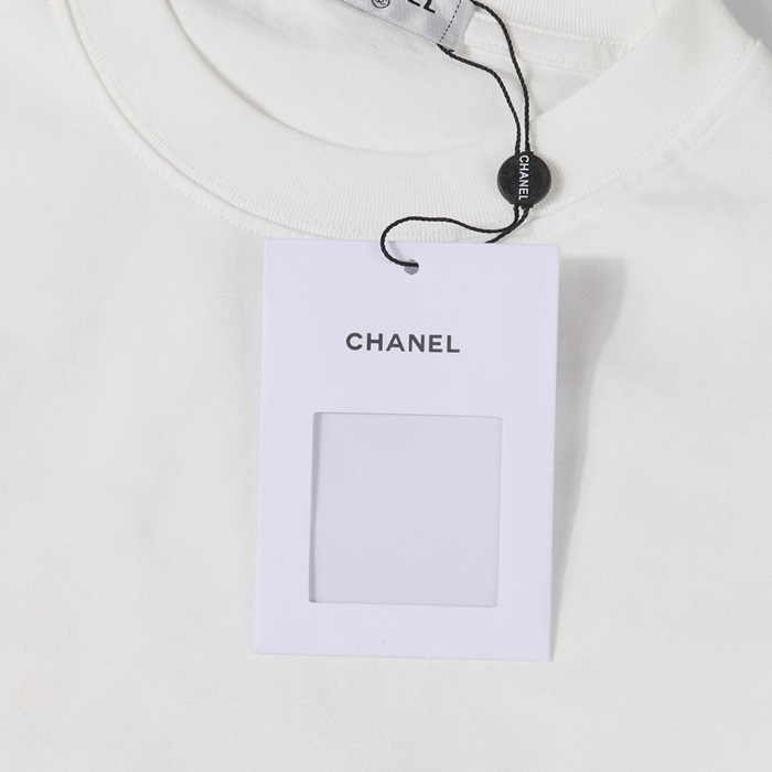 シャネルユニセックスクルーネックホワイト半袖Tシャツh482